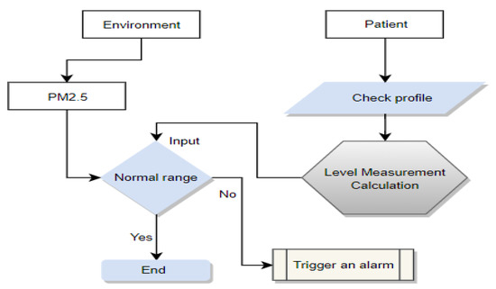 An example of risk recognition reasoning based on an SWRL rule is presented in the next flowchart (Figure 4). This example illustrates a further explanation of risk management processes that are based on the subject, condition and event. In this example, we consider an asthma patient from a certain profile is walking outdoors. According to the proposed method, the patient and environment are the subjects to be tracked, the medical profile and location are classified as condition indicators, while the PM2.5 level is a potential risk event. Then, the risk situation is recognized; in this case, the rule refers that there is a serious risk where the level of PM2.5 is too high.