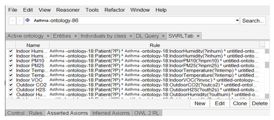 In contrast, Pellet reasoner was chosen to meet the system requirements. The protection rules were written in SWRL. The SWRLTab plugin in the Protégé 5.5 Editor provides a set of standalone graphical interfaces for managing SWRL rules (Figure 6). This asthma ontology is given in the open access link [41].