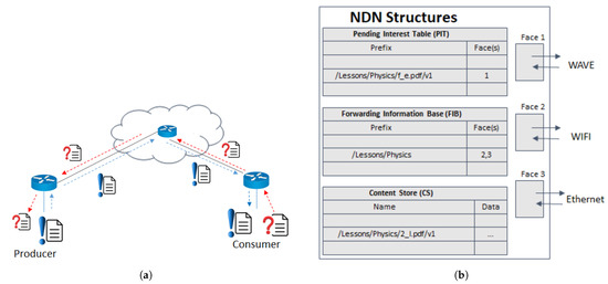 NDN basic principle. (a) Consumer and Producer interaction. (b) Node’s control structures.