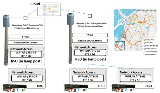 As illustrated in the left side of Figure 3, network nodes are also installed in the vehicles and local boats to transmit mobility and environment data to the data processing centre. In the vehicular network supported by ATCLL, the vehicles are equipped with On-Board Units (OBUs) to establish a connection with the Road Side Units (RSUs) and with the other vehicles. OBUs and RSUs were implemented using PC Engines APUs (https://www.pcengines.ch/apu.htm accessed on 7 June 2022) (Photo on the right side of the Figure 4) using an Ubuntu Linux distribution, offering vehicle-to-vehicle and vehicle-to-infrastructure communication over IEEE 802.11p interfaces (WAVE with ITS-G5 support), Wi-Fi, Ethernet and cellular communication (ready to integrate 5G modules). APUs use CPU AMD GX-412TC with 4 cores, 4GB DRAM, 30GB HDD, and Debian GNU/Linux 11.