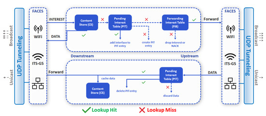 In its current state, the NDN platform does not intrinsically transmit traffic in the physical medium; instead, its network layer protocol makes use of the existing foundations set by IP which includes physical channels such as Ethernet wires and logical connections such as UDP or TCP tunnels over the existing Internet (Figure 5). To this extent, all communications between two direct nodes, as is the case with edge nodes and routers in the infrastructure, use UDP tunnelling to successfully route data (Interest or DAta packets) amongst them. On the other hand, when using the wireless medium, mainly between edge and mobile nodes, communications will take effect in a broadcast manner, in which all nodes will receive and transmit data without being directly influenced by its neighbours as expected from the case under study.