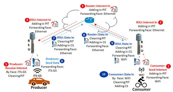 - Bouk, S.H.; Ahmed, S.H.; Kim, D.; Song, H. Named-Data-Networking-Based ITS for Smart Cities. IEEE Commun. Mag. 2017, 55, 105–111. [Google Scholar] [CrossRef]