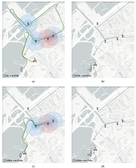At first, the vehicle maneuver through an itinerary that connects with all four considered RSUs at some point in time, with the sole purpose of retrieving content that it is interested in, under the form of real files consisting of images and text documents, caching them for future use (Figure 7a). After 574 s, the vehicle completes its fist itinerary and move towards the pedestrian which is placed outside the coverage of any given RSU, meaning that its only point of contact with the contents is through the moving vehicle. At this moment, the pedestrian downloads the content from the vehicle’s Content Store (Figure 7b). Then, after 1000 s the vehicle starts a second trip around the city to retrieve the remaining contents from the RSUs. This second trip is shorter than the previous, and the vehicle contacts only with three RSUs (Figure 7c). Finally, the vehicle ends its journey next to the pedestrian, providing another opportunity for the pedestrian to retrieve the remaining contents from the vehicle’s cache (Figure 7d).