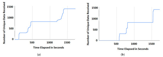 Figure 8 presents the raw number of unique content chunks received by both types of mobile nodes in the network-vehicle and pedestrian. By interlacing the jumps in the amount of data received with the layout of the edge nodes in the network, we can observe the first itinerary of the vehicle (between 100 and 450 s in Figure 8a). Following this initial behavior, we see that the vehicle stops receiving content for a while, while the pedestrian starts to receive content, despite being isolated from the infrastructure, which proves that both mobile nodes made contact and the latter received the data through cache’s vehicle. Then, the vehicle entering the second part of the circuit received the exclusive additional data, while the pedestrian retrieved all the additional content available in the second cycle. In general, we see that, although the vehicle could not retrieve the full extent of the available files, it was able to properly download data from RSUs placed around the city and deliver its content to other nodes via caching mechanisms.