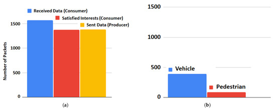 Figure 9a presents an overview of the number of packets (Interests and Data) transmitted and received by the vehicle. On the one hand, the number of packets shown by the red (satisfied Interests) and yellow (sent Data) bars shows that few retransmissions occurred when contact with the network was possible. On the other hand, the blue bar shows the small amount of replicated data due to the vehicle’s simultaneous contact with several RSUs, mainly in the central part of the city where three edge nodes coexist. The results related to the mobile node representing the pedestrian were unconsidered as they took full advantage of the connection time to the vehicle, downloading all available cached contents with minimal retransmissions. Any Interest packets that resulted in timeouts and subsequent retransmission by the mobile nodes occur due to absence of contact with the network as opposed to issues regarding efficient Forwarding of the content through available paths. This can be addressed by adding more points of contact to the network.