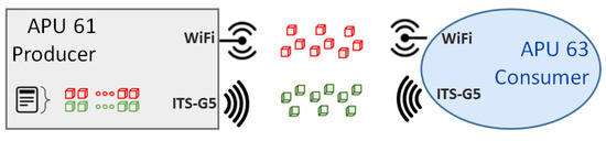 To implement our NDN using containers we opted for Docker (https://www.docker.com/ accessed on 7 June 2022). Docker is a platform for service virtualization where containers operate in isolation using their own software, libraries and configuration files. We prepare our Docker base image with S.O. Ubuntu (https://ubuntu.com accessed on 7 June 2022) where we install our NDN implementation. From this base image, we created a container on each node (RSU/OBU), highlighted in red in Figure 4, and configured them to communicate with each other, both by IEEE 802.11 Wi-Fi and by ITS-G5, in order to constitute a parallel and independent network.