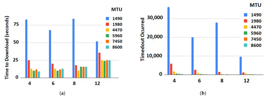 These values can be further attested by verifying the number of occurred timeouts for the different network characteristics, as depicted in Figure 11b. As the number of Interest timeouts increases, the number of timeouts naturally decreases because more time is given for the data packet to be delivered. However, it also needs to be taken into account that higher Interest timeout values will result in delayed Interest retransmissions, if needed, and consequently longer download times. To this extent, it is emphasized that a middle term must be achieved for a proper and reliable behavior of the network altogether.