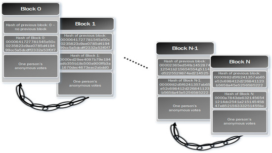 The city’s BPES would be independent yet connected to the county’s BPES, as shown in Figure 2. The city may have any number of poll voting systems that act independently of the county system. However, one primary city system in the county will send a tally to the county system. A county has votes during an election that include their county or cities in addition to any votes necessary at the state level. The results for each county are added to a blockchain on a similar state system working in conjunction with the county’s independent system for the votes the state needs. Basically, the county-centralized system sends the tally of their county’s state votes on the blockchain part of the state’s system, much like the city did to the county system. The blockchain would look like Figure 3 but would be one county’s votes, and that county would not be anonymous. It would include that county’s digital ID. It would be an extra security protocol, as that county’s public key would sign the blockchain, providing a means of nonrepudiation and integrity for each county. This would allow one to know where the votes came from and if the votes had been tampered with.