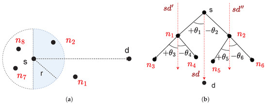 The message-forwarding mechanism uses relay nodes to send messages from a source node s to a destination node d. Figure 1. illustrates an idea of probing and selecting a relay at one- and two-hop transmission distances from a message-carrying node. Several referential lines , , and show directional information and angle calculation. To select a one-hop relay, only the front direction with respect to d is scanned, as shown in Figure 1a. Thus, only and will be considered by relay selection and nodes and will be ignored. The scanning process helps in filtering relay nodes in a broadcast coverage and avoids redundant message overhead to other nodes in the backward direction. To select one- and two-hop relays, we measure the geometric angle at each of the one- and two-hop distances, as described in the following two steps.