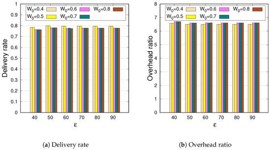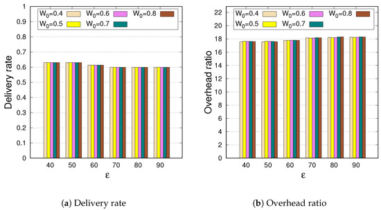 - Transmission overhead ratio: This metric is the ratio of the total times any original messages and replicas were transferred between intermediate nodes to the total amount of distinct messages received by their destinations during the simulation. With and , the overhead ratio is given as .