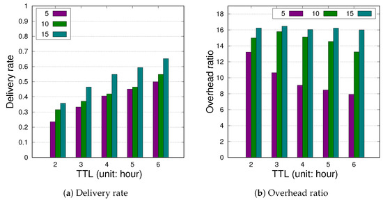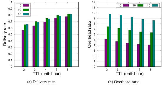 Figure 7 and Figure 8 display the influence of L with respect to the variance of the TTL values in the range of [2, 6] h under TVCM and NCCU. Given the buffer size of 10 MB on each node, the results in Figure 7 exhibit that both the delivery rate and overhead ratio increase as L increases from 5 to 15 regardless of the TTL values. The overhead ratio increases as L increases from 5 to 15 in Figure 8, whereas the delivery rate increases as L increases from 5 to 10. However, for 15, the delivery rate decreases for the TTL from 3 to 6. A buffer overflow possibly occurs more times with the limited buffer and higher node population in NCCU. It is noted that the overhead ratio is more sensitive to the incremental TTL values. This is because with a larger L value, more pending messages in the finite buffer capacity could be replaced frequently, thereby causing higher transmission overhead, as shown in Figure 7b and Figure 8b.