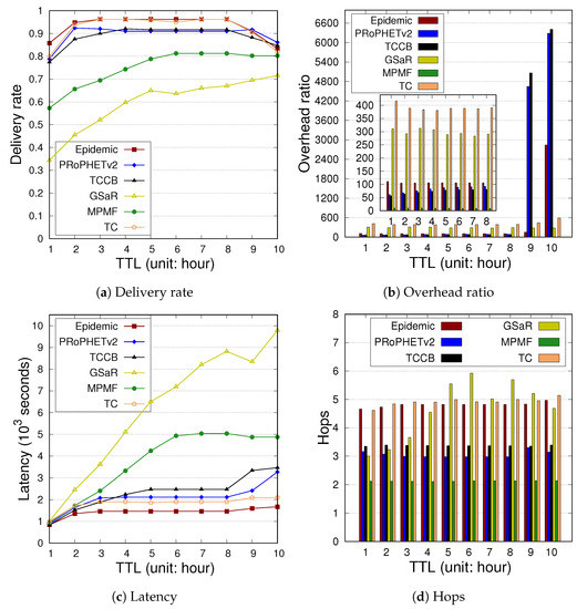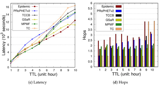 Figure 10 depicts the comparative results under the NCCU trace. As the results in Figure 10a indicate, Epidemic, TCCB, TC, and PRoPHETv2 perform better. However, as depicted in Figure 10b, the overhead ratio is higher and drastically increases as TTL > 8 h. GSaR induces more overhead ratio and a lower delivery rate when the TTL increases from 1 to 8. As depicted in Figure 10c,d, both latency and hops in GSaR are higher as compared with other policies. In the case of NCCU with a higher node density, nodes have higher chances of contacting other nodes. A message replicated more times can induce higher hops. In GSaR, the policy of deleting a message probably decreases the chances of reaching the message earlier to the destination and thus causes higher latency.