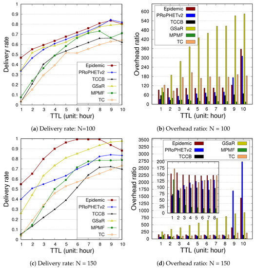 As shown in Figure 11, all policies can increase the successful delivery rate with a longer TTL, where the number of nodes is set to be N = 100 in Figure 11a,b, and N = 150 in Figure 11c,d. Epidemic and GSaR unbound replicate messages, thereby inducing more message overhead. Similar to Figure 9a, Figure 10a and Figure 11a,c depict the decrease in delivery rate when the TTL > 8 h in Epidemic and TCCB. Compared with Figure 9 and Figure 11b,d, an increase in the overhead ratio is displayed. In the MPMF, the increase in overhead is lower with a larger TTL than the other policies. Although increasing the node population can increase the encounter rate, the delivery rate is not affected in the case of MPMF. In the MPMF, the number of message copies for each message is fixed; then, nodes with a copy of the message keep waiting for the destination without forwarding. This makes messages kept in the buffer longer. Because of the TTL timeout or buffer overflow, messages are unable to reach the destination node. Notice that in the case of NCCU, nodes are scattered in a large space, while nodes move in the same confined area in TVCM. Therefore, in the case of GSaR, messages have higher chances of reaching a destination. With the increase in contact frequency in the case of a larger node population, the numbers of forwarded messages in GSaR and PRoPHETv2 increase, thus resulting in a higher delivery rate and overhead ratio. In TC, with the increase in node population, the number of formed communities becomes larger. Therefore, a node can belong to several communities and help deliver messages to a target node, resulting in a higher delivery rate, as shown in Figure 11a,c.