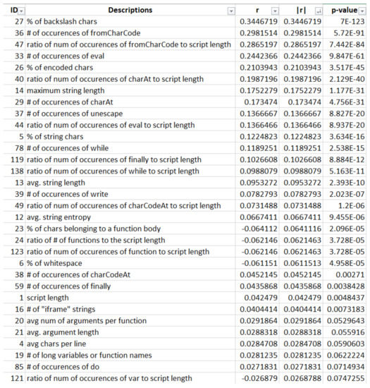 The static analysis of JavaScript files produces characteristics that can be used in JavaScript. The features of JavaScript can be broken down into two categories: statistical and lexical. To extract features out of each section of JavaScript code, a total of 170 characteristics are used. Table 1 outlines the characteristics along with brief explanations of each one. Figure 2 shows the correlation coefficients of different features.