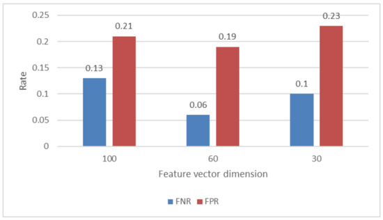The false positive rate (FPR) and false negative rate (FNR) for three different dimensions of feature vector.