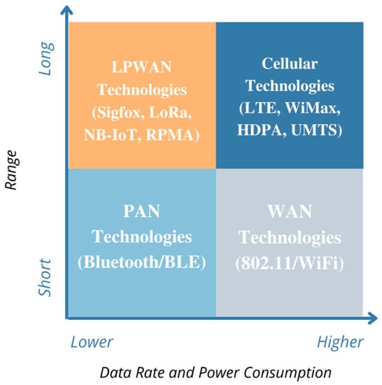 Short- and medium-range wireless protocols such as Bluetooth, WiFi, and ZigBee are range- and power-restricted, so they are not an ideal fit for IoT applications. Additionally, traditional long-range wireless protocols usually have strict power requirements that are not suitable for battery-powered devices [5]. The need for low-power and wide-area networks (LPWANs) to connect massive numbers of sensors with battery lives ranging from 5 to 10 years and modules, enabling low-cost, long-range coverage, has led to the third class of connectivity (Figure 1). The third class or LPWAN has evolved the IoT development process and is available as licensed and unlicensed bands.