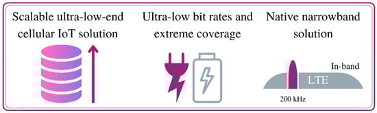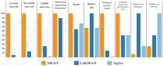 Based on the features [27,28] organized in Table 1, a respective visualization of the advantages of Sigfox, NB-IoT, and LoRaWAN is provided in Figure 3.