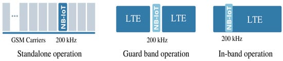 The NB-IoT channels follow a reused and extended model based on the LTE design. For instance, an NB-IoT carrier uses twelve 15 kHz sub-carriers for a total of 180 kHz [15]. NB-IoT can coexist with GSM (Global System for Mobile Communications) and LTE systems in licensed frequencies (e.g., 700 MHz, 800 MHz, and 900 MHz). NB-IoT’s frequency bandwidth of 200 kHz corresponds to one resource block in GSM and LTE. There are three operation modes regarding the bandwidth in NB-IoT. In a stand-alone type of operation, the utilization of the GSM frequencies that are currently used is possible. In guard-band operation, the unused resource blocks within an LTE carrier’s guard-band are supported and the in-band operation utilizes resource blocks within an LTE carrier [18]. The next chapter gives a more detailed view of the operation modes of NB-IoT and its architecture.