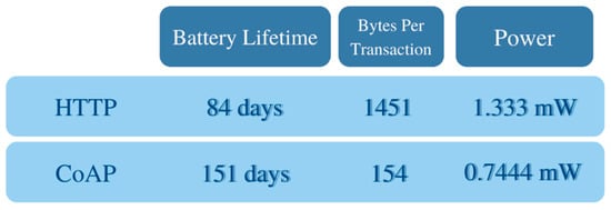 Given the diversity of IoT devices, it is crucial to use the right protocol, which depends on each layer’s architecture. MQTT and CoAP are usually the first choices for IoT purposes, supporting small message sizes, message management measures, and lightweight message overheads. The MQTT protocol is ideal for IoT and M2M communications and can provide routing for small, cheap, low-power, and low-memory devices in vulnerable and low-bandwidth networks. Another favorite protocol, CoAP, uses the request–response communication model at the application layer. Its design enables devices with low power and limited computation and communication capabilities that do not support TCP to use RESTful interactions and provides resource-constrained devices with web service functionalities. It utilizes both synchronous and asynchronous responses but does not include any built-in security features. CoAP and MQTT both have low-header overheads, low message delivery delays, and low computing resource consumption rates; however, CoAP is HTTP-like, enabling the interaction of CoAP-enabled devices in the same way as a device using a traditional REST-based API, and can be used to refashion simple HTTP interfaces between the client and server. Millions of devices are estimated to be deployed in various application domains using CoAP.