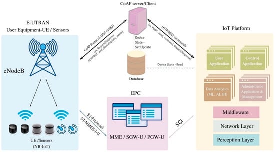 NB-IoT can be supported by LTE systems only if an upgrade in the software is performed, meaning it is ideal for in-market applications that have a mature LTE base. It also provides enhancements in terms of cost decrements and energy consumption savings because of its reduced protocol and bandwidth (180–200 kHz) requirements and higher data rate. NB-IoT has an extended coverage range (up to 20 dB) and a power-saving mode allowing over 10 years of battery life. It conveniently manages an increased number of linked tools and applies sleep algorithms to extend the node battery lifetime while lowering the deployment complexity and decreasing the data latency to 10 s or less for 99% of the devices. NB-IoT applications are broad, including automation processes in intelligent factories, intelligent mining, and applications in high-speed railways. The data transferred through IoT components are treated as big data that require complex techniques for data analytics and machine learning, so the huge volumes of data and value extraction processes are inseparable from IoT. As the data volume increases, the need for security grows, so each layer of the IoT architecture has to ensure its security, authenticity, and integrity. An IoT design must implement relevant analytics engines, data analytics algorithms, and security measures on every level, otherwise the whole IoT system in a city can be its largest attack surface.