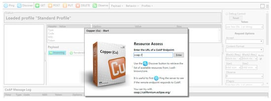 - Kovatsch, M. Copper4Cr: Copper (Cu) CoAP User-Agent for Chrome. JavaScript Implementation. Available online: https://github.com/mkovatsc/Copper4Cr (accessed on 15 May 2022).