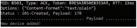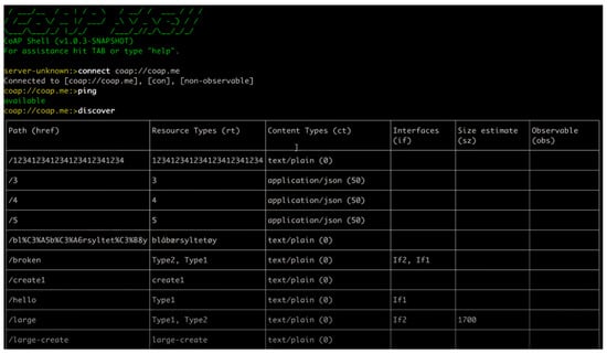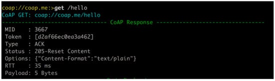 Many software libraries have been developed to implement CoAP-enabled services [52], and CoAP protocol testing can be performed using the CoAP Shell library (Figure 21) in the following way [53]. For any CRUD method, the CoAP response consists of the MID (message-ID), token, type (as discussed in Section 5.1), status, options, RTT (round trip time), and payload (Figure 22).
