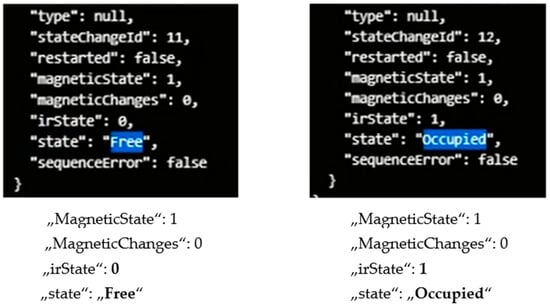 As can be seen in Figure 24, a sensor with a certain identifier changes from state-magneticState to irState, so the state of the occupancy of the current parking spot is updated as well. As a result, the free status (“stateChangeId: 11”) at the time of the car arrival simulations (covering the sensor with a metal plate) has turned into the occupied status (“stateChangeId”: 12). For this specific test case, the answers contain other information too, such as the “message-ID”, “timestamp”, “event”, and the “id” of the node.