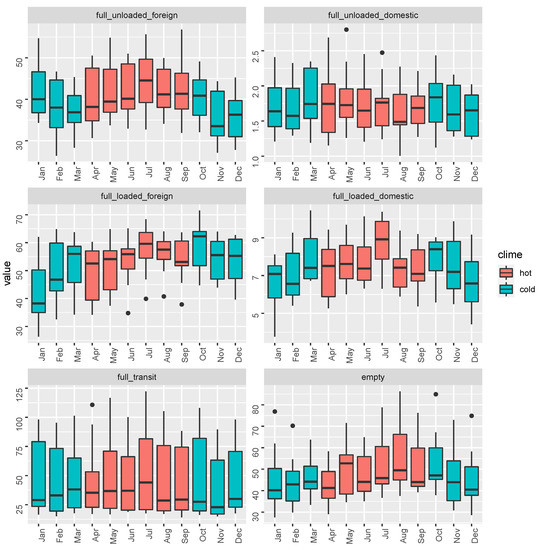 Figure 4 shows the box plots for the different container types grouped by month. The red boxes refer to the warm months, while the blue ones represent the cold months. Some common elements can be observed among the different series. First, we observed that container traffic increased in the warm weather months, but this effect was more pronounced in some series and less so in others.