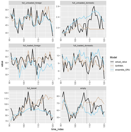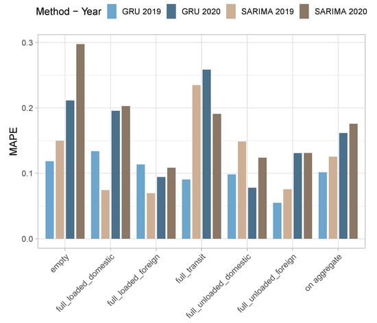 Table 3 compares the results of the SARIMA models against the LSTM, CONV, and GRU models with tanh activation in both forecasting scenarios. For the deep learning models, we considered the ensemble prediction, obtained as the average of the forecasts in 10 different runs. The MAPEs obtained by the different methods were reported at the single time series level and at the aggregate level, where all values were summed. First, we observed that the errors increased dramatically when moving from the 2019 forecasting scenario to the 2020 forecasts. This is quite reasonable, since container traffic volume showed a highly irregular pattern over the last year due to the COVID-19 outbreak. In addition, it is visible that the LSTM and GRU methods produced a lower global MAPE than the SARIMA models in both forecasting scenarios. On the contrary, the CONV model had poorer performances. This probably suggests that the evolution of container traffic can be better modelled by using recurrent neural network architectures than convolutional ones. Considering both scenarios, the GRU model appeared to be the best model. A further comparison between the performances of the GRU and SARIMA models is depicted in Figure 6 using barplots. Looking at the performance on individual series, in the 2019 forecasts, we observed that the improvement induced by the GRU models was especially large for the “full transit” and “empty” container volumes, which were two of the largest series in terms of size. In particular, the training of the deep learning models was carried out simultaneously on all data and pursued the minimisation of the global MAE in the training set. In this setting, it is not surprising that the learning algorithm put more weight on the larger series, which could produce larger residues, than the smaller ones. At the same time, the SARIMA approach appeared to be highly competitive on both “full loaded” series. The comparison between the forecasts obtained by the GRU and SARIMA models in this forecasting scenario is also graphically represented in Figure 7. In the 2020 forecasts, the GRU and LSTM models still overperformed the SARIMA model at the overall level, but the improvement appeared to be smaller. In this scenario, the only case in which the SARIMA approach yielded a lower MAPE than the GRU was the “full transit” container traffic volume. This evidence is in contrast with that observed in the first forecasting scenario. However, when analysing in greater detail the behaviour of the “full transit” container volume traffic, we observed that this series presented a large downward peak in the initial months of 2020 and a rebound in the summer months of 2020. All of the models investigated failed to predict the evolution of the “full transit” series, and this is not surprising given that these troughs were probably due to the COVID-19 outbreak. The reasons why the effects of the pandemic on the predictive ability of models were large in this particular series have yet to be clarified, and we plan to shed some light on this theme in a forthcoming work.