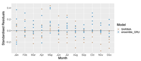 Figure 8 shows the standardised residuals obtained by the SARIMA and GRU model, distinguished by month for all the time-series data. We observed that both models presented positive and negative residuals in all months. This evidence suggests that the SARIMA and the GRU model did not have a systematic error component. Furthermore, we note that the amplitude of the errors was generally stable over the different months.