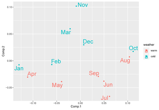 Graphical representation of the months embedding after the dimensionality reduction (from 5 to 2) via principal component analysis.