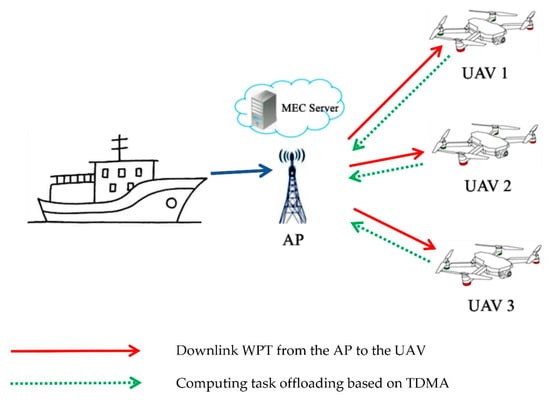 This paper considers a wireless-powered MEC network system, which is composed of a multi-antenna AP integrated with an edge server and a set of single-antenna UAVs placed on the ship. The AP has a stable power supply and higher computing power than the UAV. The AP can not only receive data from the UAV for calculation, but also transmit power to the UAV through WPT. The computing tasks of the UAV can be executed locally or offloaded to the MEC for computing, following by the transmission of the returned results. At the same time, the wireless energy transmitted by the harvesting AP can be used for local computing or task offloading, and the residual energy can be used to charge the battery. The system model is shown in Figure 1.