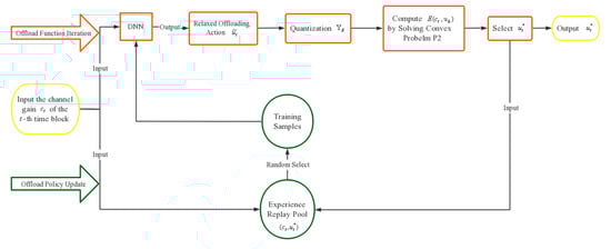 At the time block, the wireless channel gain is , where . When , the parameter of the DNN is randomly initialized according to the standard normal distribution with zero mean. The DNN outputs the first offloading action according to the formula , which is expressed by the following formula: