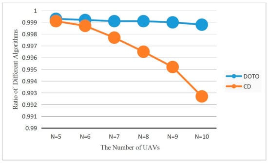 In this section, we evaluate the decision quality of the DOTO algorithm. Firstly, the optimal offloading decision of each time block is found from all offloading actions of UAVs. Then, we find the total residual energy of the UAV in the MEC system obtained within 10,000 time blocks under the three modes of the DOTO algorithm, CD algorithm and optimal offloading decision. In Figure 4, we compare the ratio of the results of the DOTO algorithm and the CD algorithm to the results of the optimal offloading decision. The closer the curve in the figure is to 1, the better the algorithm’s performance. From the results in Figure 4, it can be seen that when the number of UAVs in the MEC system varies between 5 and 10, the DOTO algorithm performs better than the CD algorithm. When the number of devices increases, the performance of the two modes decreases gradually. However, the trend of performance degradation for the DOTO algorithm is more gradual than that of the CD algorithm. When the number of devices increases, the performance gap between the two algorithms is larger. When there are 10 UAVs, the DOTO algorithm can still obtain 99.9% of the residual energy. However, the CD algorithm can obtain 99.2% of the residual energy because, when the number of devices increases, the possible offloading actions increase exponentially. At this time, the simple two-dimensional search of the CD algorithm is unable to search for the global optimal solution, so the performance of the algorithm becomes increasingly worse. The DOTO algorithm benefits from the powerful fitting effect of the DNN, and even if the number of devices is large, the data sample training is sufficient. Therefore, the performance of the algorithm is relatively better and more stable.