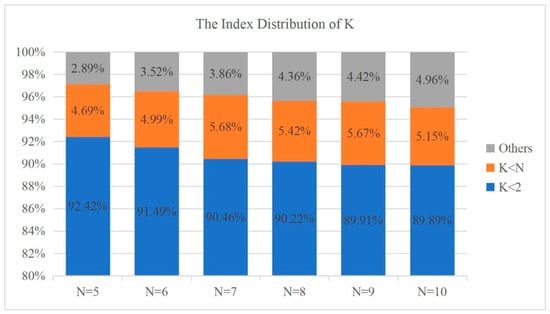 In Figure 5, we show the value index distribution in 10,000 time blocks when the number of UAVs accessed in the MEC system is 5 to 10. At this time, the value is mostly 0 or 1, but there are also some other values. When the number of UAVs increases, the final value fluctuates more. However, more than 95% are within the value and below. Therefore, in the adaptive value setting method, this paper finally sets the minimum to the value. The experiments in Section 6.1 have demonstrated that the DOTO algorithm with such an adaptive value setting can obtain satisfactory suboptimal solutions.