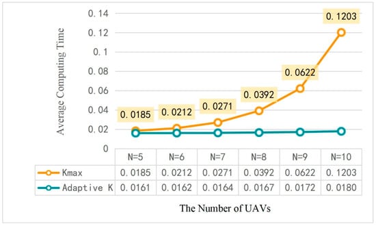 In Figure 6, we show the influence of the adaptive on the computational complexity of the DOTO algorithm. It shows that the computational complexity of the DOTO algorithm can be greatly reduced under the condition of ensuring the performance of the algorithm. When the value of is , as the number of UAVs in the MEC system increases, the time consumed by the offloading strategy will increase significantly. When the number of access devices is 10, the average time required for each offloading decision reaches 0.1203 s. At this time, the delay is too high, and it is no longer suitable for solving practical problems. Moreover, when the number of devices continues to increase, the delay will be more serious. When the adaptive value setting is adopted, the average calculation time of the DOTO algorithm is relatively stable, and there is no obvious change. The required time is also approximately 0.017 s, which is short and can be well applied to the actual model. The computational complexity of the DOTO algorithm is reduced from an exponential relationship to a linear relationship.