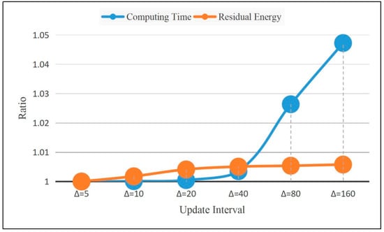 The corresponding calculation time and residual energy when adaptive adopts different update intervals . Here, we set .