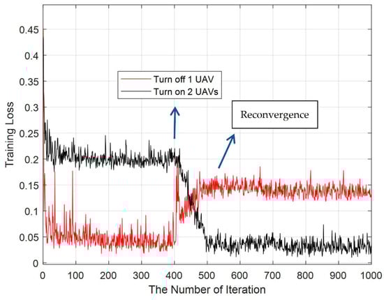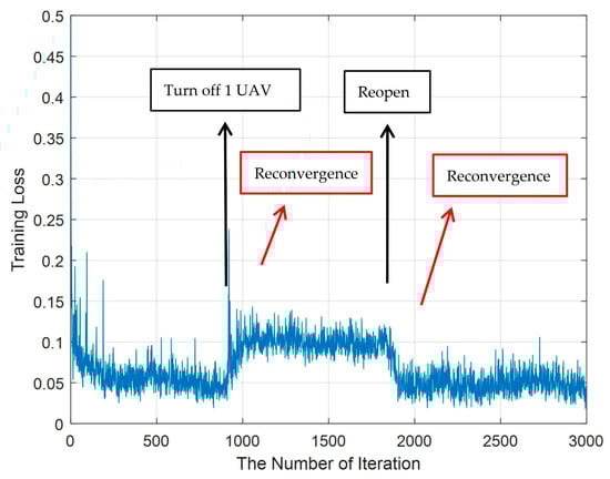 The convergence performance of the training loss when randomly turning one UAV off and then reopening it.