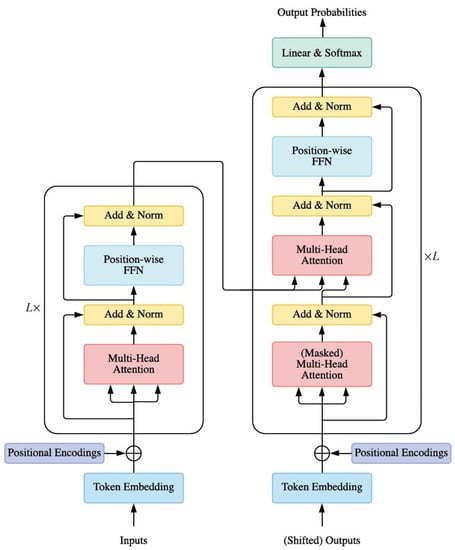 The basic Transformer architecture is a sequence-to-sequence mapping model that includes an encoder and a decoder, both consisting of a stack of L identical blocks. Each encoder block, in turn, consists of a multi-head self-attention module and a position-wise feed-forward network (FFN). Decoder blocks additionally insert cross-attention modules between the multi-head self-attention modules and the position-wise FFNs. Furthermore, the self-attention modules in the decoder are adapted to prevent one position from attending to subsequent positions in a non-causal way. The overall vanilla Transformer architecture is shown in Figure 1.