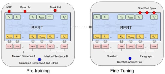 The pre-training procedure has been based on the BookCorpus (800 M words) [23] and English Wikipedia. The model thus pre-trained can then be used in many NLP tasks, applying a relatively inexpensive (if compared to the pre-training phase) fine-tuning process. Fine-tuning is pretty straightforward: for each task, the task-specific inputs and outputs are plugged into BERT, and all the transformer parameters are then fine-tuned end-to-end.