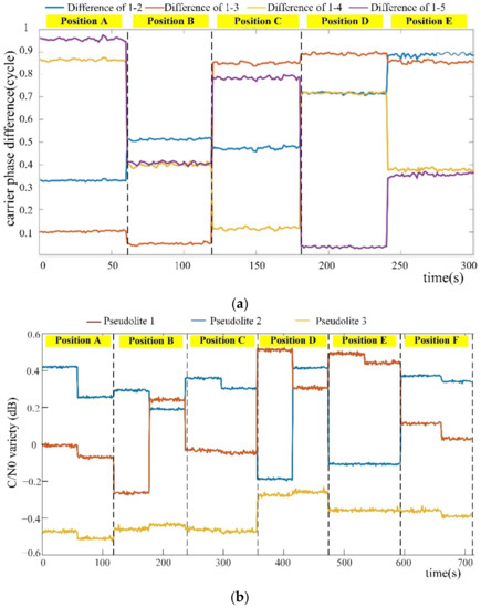 Location specificity and stability of carrier phase difference and C/N0. (a) Location specificity and stability of carrier phase difference. (b) Location specificity and stability of C/N0.