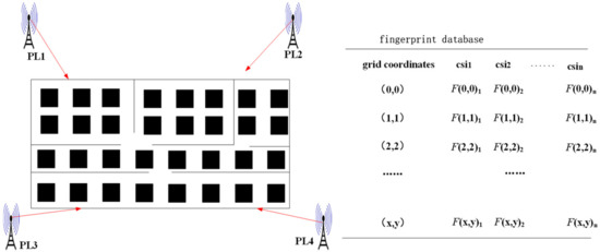 The correspondence between location and fingerprint is established in the offline phase, as shown in Figure 3. The space area is gridded, and pseudolites are deployed around the service area to ensure that all user receivers can receive the pseudolite signal. At each grid point, the channel observations from each pseudolite receiver are obtained through data sampling over a period of time. The grid point coordinates and the corresponding CSI fingerprints form a fingerprint feature database. This process is sometimes called the labeling stage, and this fingerprint database is sometimes called a signal map.