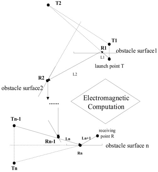 Ray Tracing (RT) is a method of simulating high-frequency electromagnetic waves in the research environment into light waves. Combined with the consistent diffraction theory, it is widely used to study the propagation of high-frequency electromagnetic waves [32,33,34,35]. On the premise that the signal frequency belongs to the high frequency band, the signal can be regarded as a ray propagating along a straight line in space and interface. The pseudolite signal adopts the L frequency band, which belongs to the ultra-high frequency band, so it conforms to the theoretical premise of ray tracing.