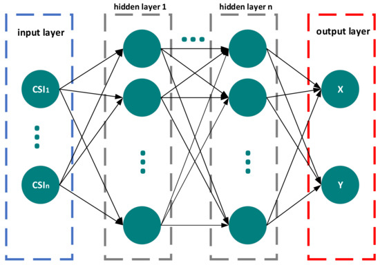 The neural network architecture for training fingerprint positioning in the existing public literature is generally shown in Figure 5, and the data of the input layer comes from the CSI information measured in the environment [41,42,43,44,45]. This approach leads to many inherent errors and inconveniences: (1) There are many obstacles in the indoor environment. The material and thickness of walls, floors, doors and windows have a great impact on the propagation of indoor pseudolite signals, and the process of environmental characterization is more complicated; (2) There are inherent errors that cannot be eliminated by relying only on measured data for model training, such as personal factors of testers, errors of the receiver itself, errors of environmental dynamic changes, etc. (3) Only relying on the actual measurement to establish a fingerprint database, the positioning coverage and positioning accuracy are limited by the collection workload.