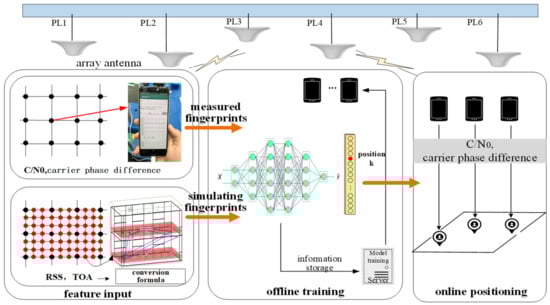 The positioning process is mainly divided into two phases: offline data acquisition and online position calculation. In the offline collection phase, sample collection is performed at the reference point, the feature values of each sample parameter are extracted, and the function mapping relationship between them and the physical reference position is learned to construct a feature fingerprint database. In the online phase, the real-time observations of the receiver are input into the feature fingerprint database, and the positioning result is obtained through matching algorithm [29,30,31].