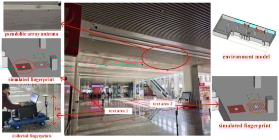 The actual measurement and simulation experiment area is the arrival hall of an airport. The scene description is shown in Table 1. Six pseudolites are arranged on the roof in an equally divided circle. There are 6 load-bearing columns on the central axis of the hall, and their cross-section is a square with a side length of 0.5 m, the material of the wall load-bearing column is concrete, the ground material is ceramic tile, the pseudolite transceiver antenna is an an omnidirectional antenna, and the store compartment has been simplified. There are two experimental areas. Text area 1 is an area where the fingerprints have been collected. In this area, manual CSI fingerprints collection is performed first, and then deterministic modeling and simulation are carried out to expand the fingerprint dataset, there are 400 sampling points with an interval of 0.25 m; Text area 2 is an area without fingerprints collection, and only the simulation fingerprint data is used to train and predict the position, there are 100 simulated sampling points with an interval of 0.5 m. The experimental environment and method are shown in Figure 7.