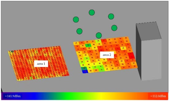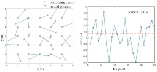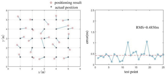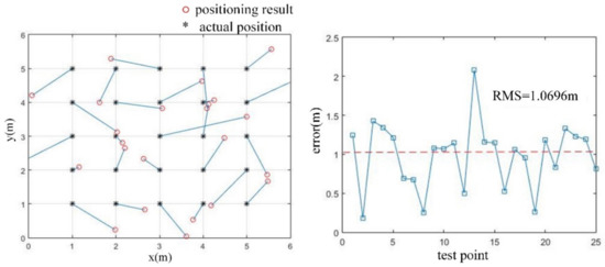 The results of the positioning data of the experiment are shown in Table 4. Figure 14 is the location test result of test area 2, and the root mean square location error is 1.1237 m. The results show that the rough positioning can be completed by simply relying on the fingerprint positioning data generated by the simulation calculation, and it can also meet the need of low-precision positioning without manual fingerprints collection.