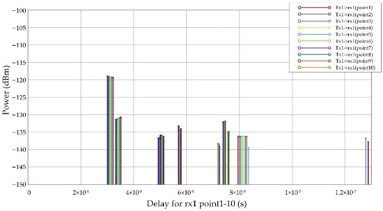 In the simulating calculation process, there are multiple propagation paths between the transmitting and receiving points. The direct path has the shortest transmission distance and the strongest reaching power. With the increase of the propagation distance and the number of reflection and transmission times, the signal transmission distance and the corresponding transmission delay also increase, and the pseudolite signal power attenuation is more serious until it is lower than the receiver signal power threshold. As shown in Figure 8 and Figure 9, the electromagnetic information of 400 test points in text area 1 and 100 test points in text area 2 is obtained through 3D ray tracing calculation, which is converted and normalized as the simulation input part. Due to space limitations, Figure 8 and Figure 9 show some examples of electromagnetic calculation results at 10 receiving test points.