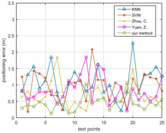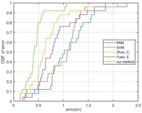 To compare the performance of different algorithms, we choose the commonly used KNN and SVM methods in fingerprint localization, and methods in [10,13] to compare with our method. The KNN and SVM model can be directly invoked through the deep learning framework Keras library. Similarly, the positioning calculation is performed at the 25 position reference points of test area 1 and compared with the true value points measured by the total station. Figure 12 is the positioning straight line distance error, and Figure 13 is the cumulative distribution function of the error. It can be seen that the root mean square (RMS) error of our method is 0.4850 m and the maximum error is 1.06 m, of which 92% are better than 1 m. Comparative experiments show that our method has higher localization accuracy than other methods, the detailed error analysis is shown in Table 3.