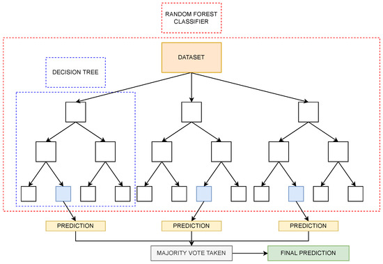 where represents identically and independently distributed random vectors, and each tree casts a unit vote for the most likely class at input x. Each tree in the collection votes (only once) to assign the sample to a class, considering the x feature vector. The final choice is to attribute the example to the class that obtained the majority of votes. A graphic representation of the algorithm is presented in Figure 2.